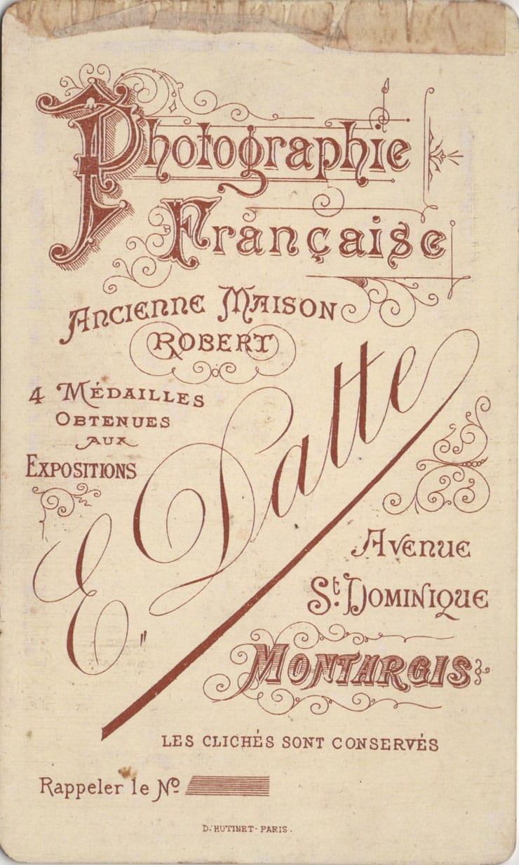Robert ayant exercé à Montargis de 1877 à 1880 environ et de 1885 à 1890, on peut supposer que le photographe E. Datte à exercé à Montargis vers 1880/1890.