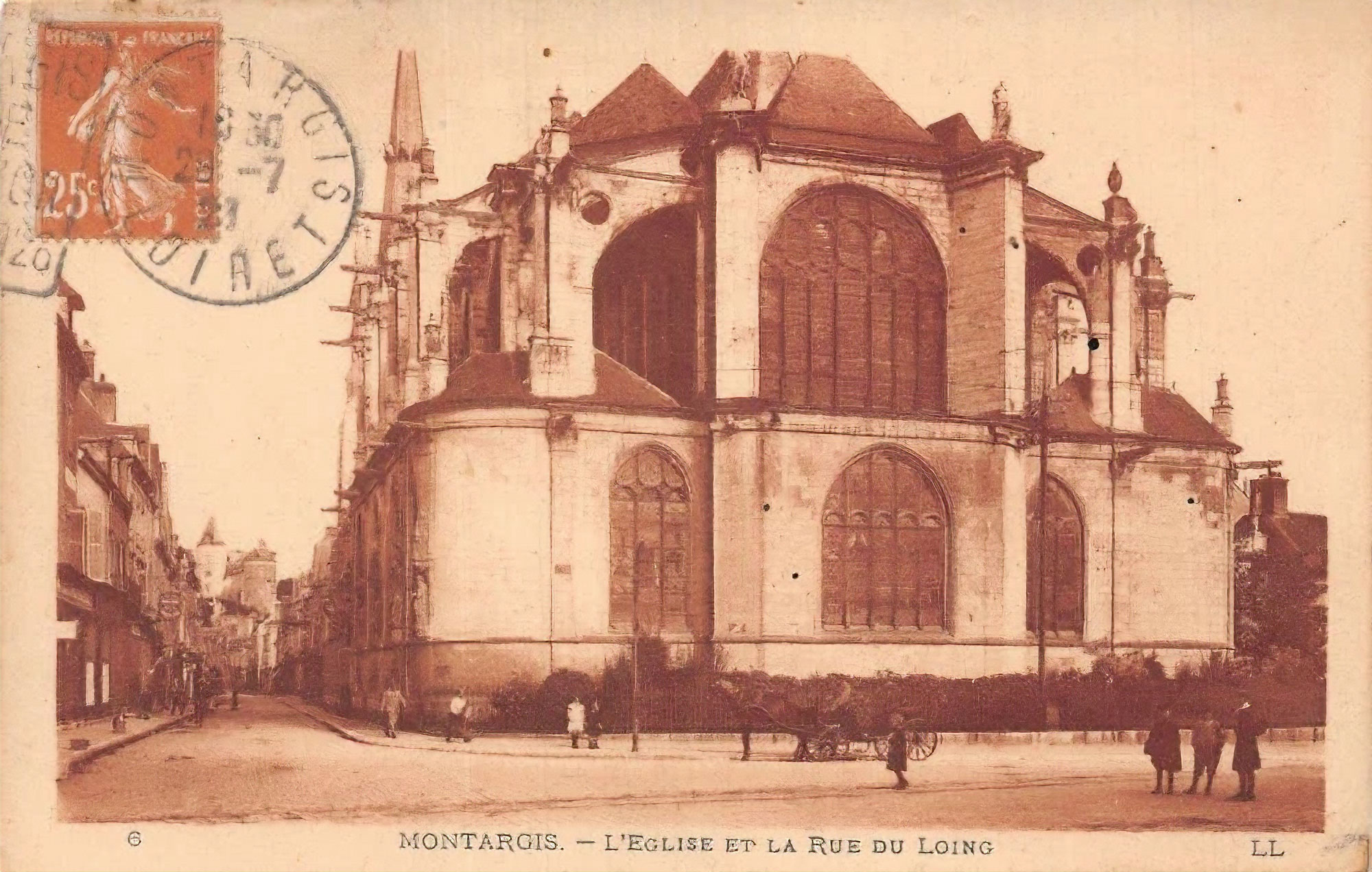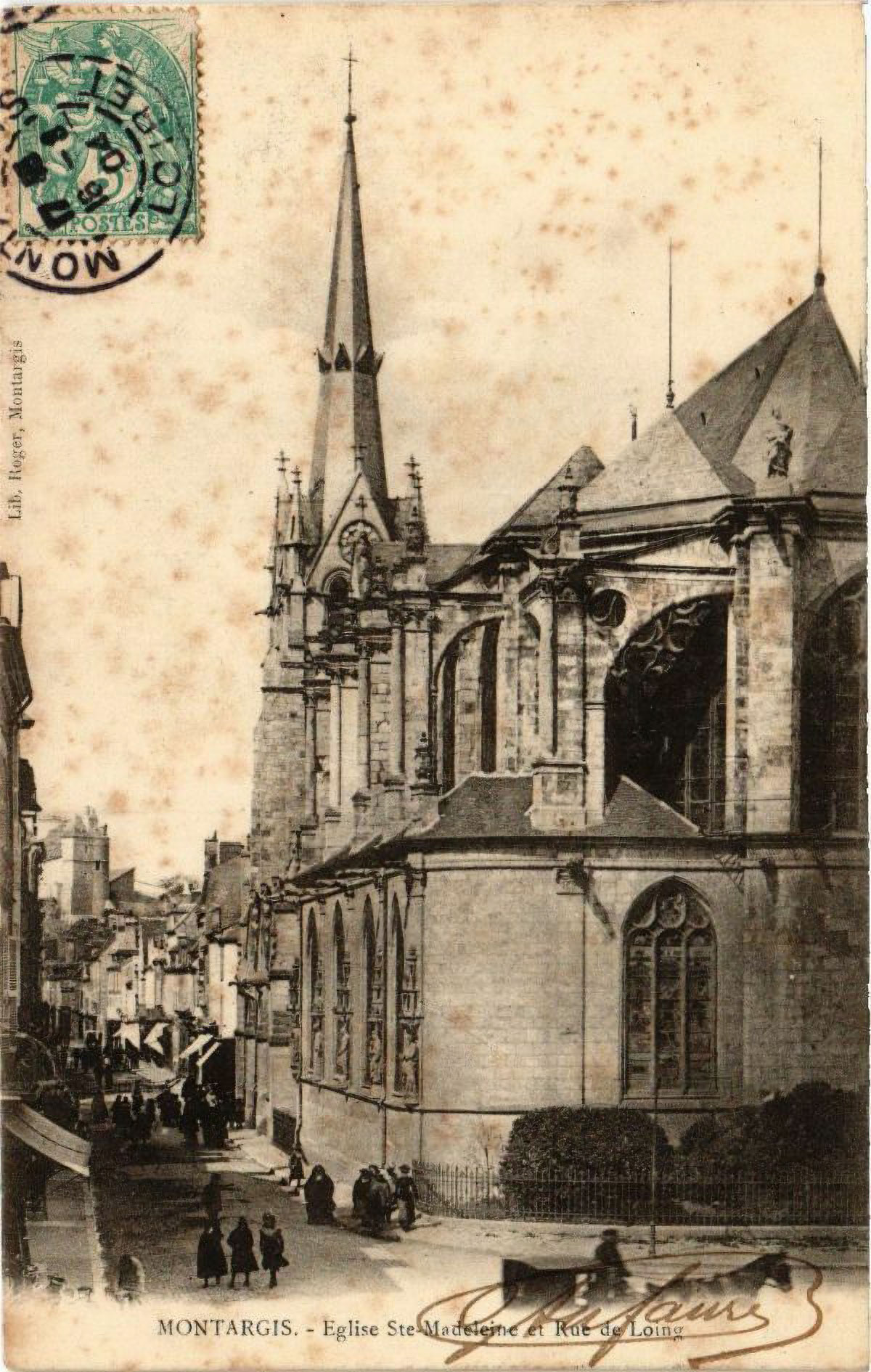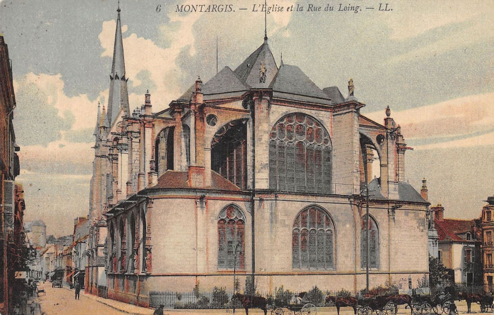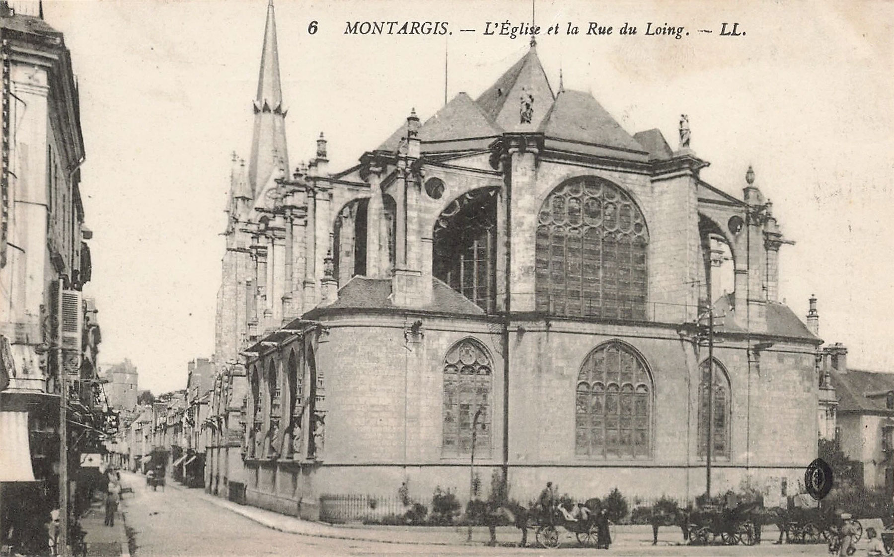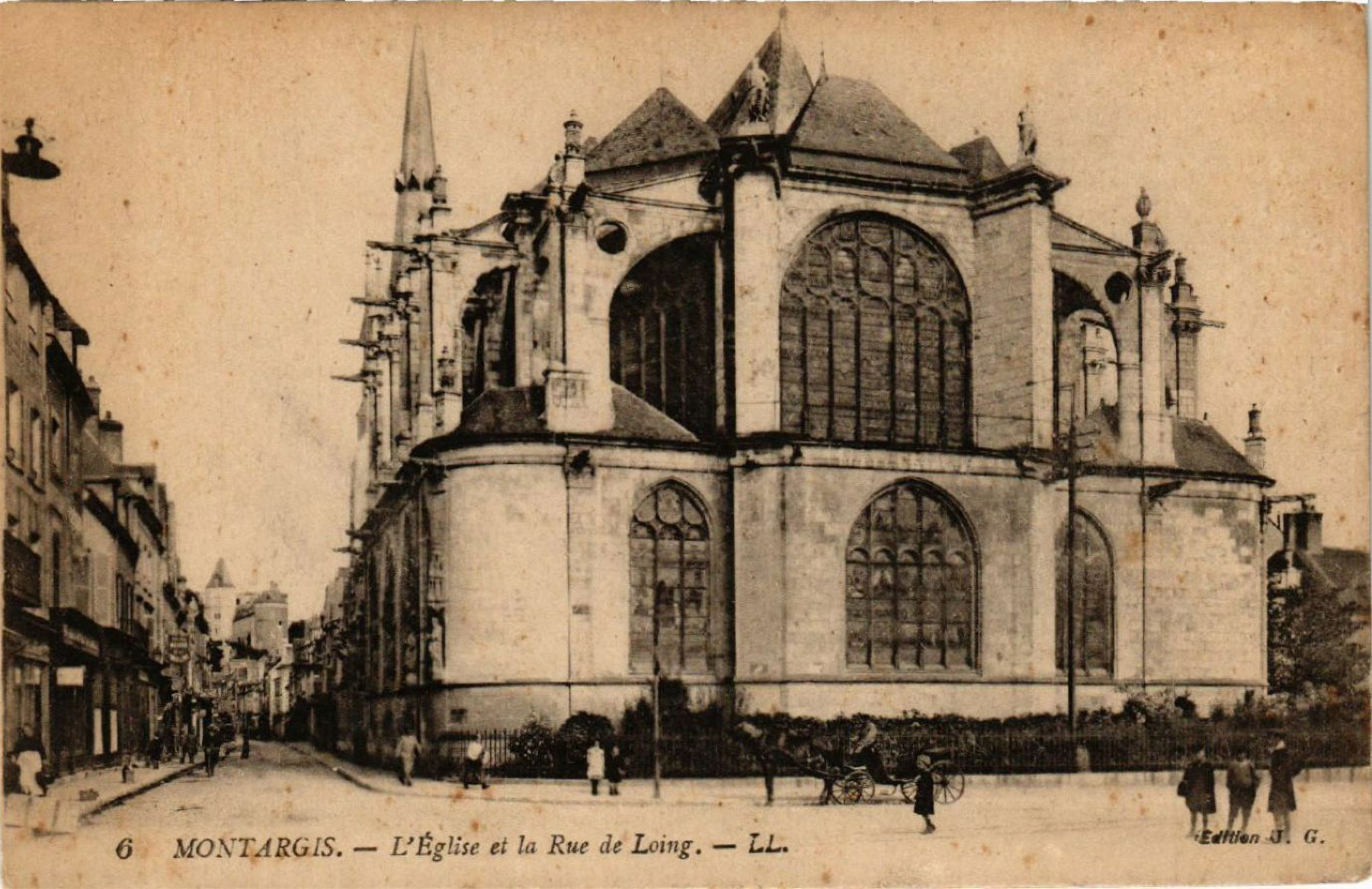 Auparavant, il y avait là un pâté de maisons assez basses, délimité par quatre rues : la première était notre rue de Loing, la deuxième devant le chevet de l’église, n’avait pas de nom officiel : on l’appelait « la ruelle du cloître » ou « la ruelle qui mène au cloître ». Il s’agissait des logements et du cloître des chanoines. Au rez-de-chaussée de ces bâtiments, il y avait des boutiques. La troisième, aujourd’hui rue Triqueti / rue du Grenier à Sel, était la rue des Pourceaux.