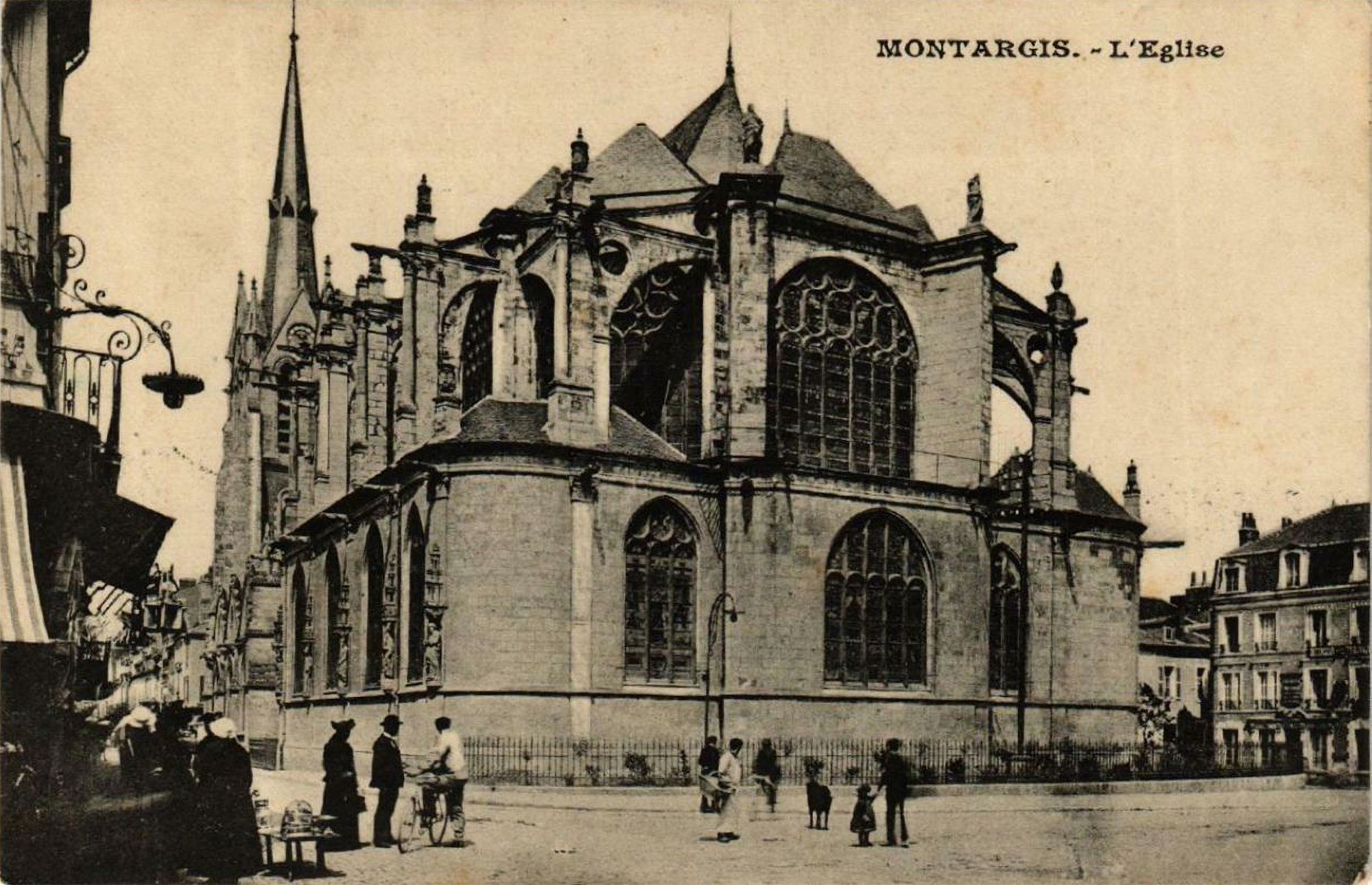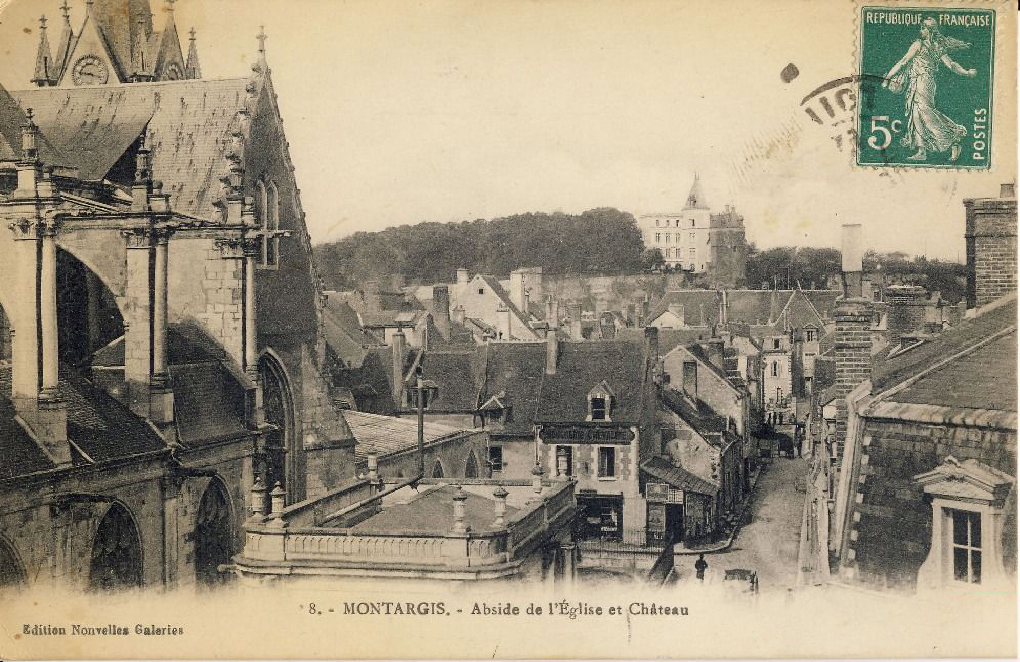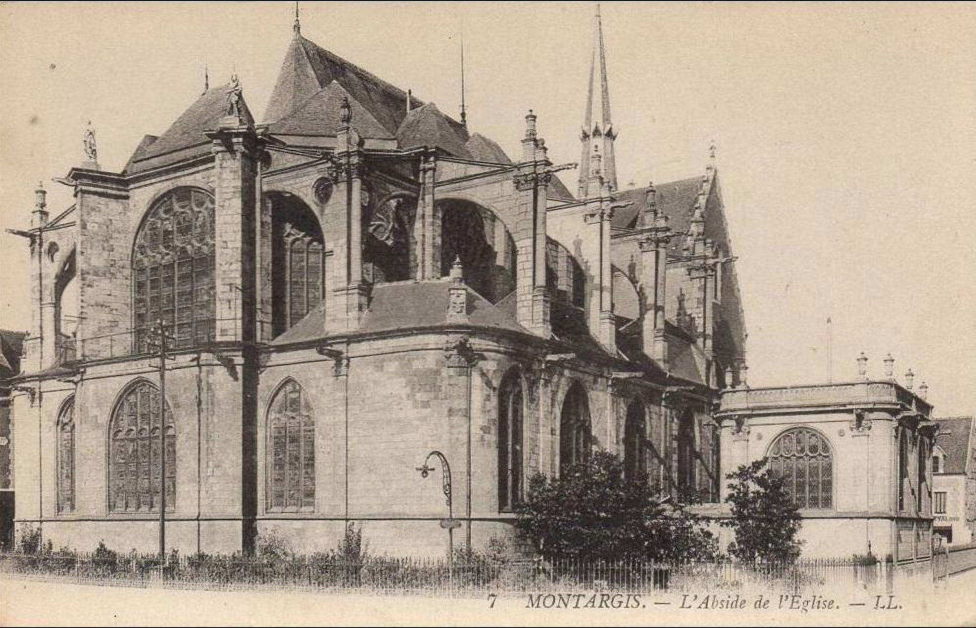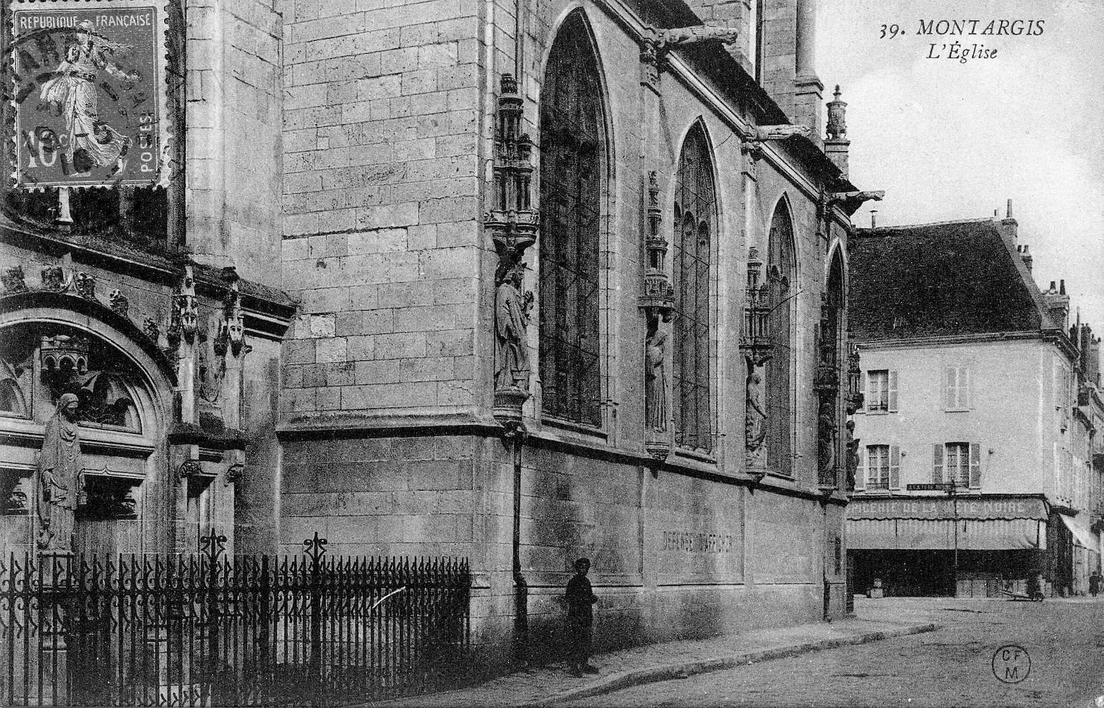 Auparavant, il y avait là un pâté de maisons assez basses, délimité par quatre rues : la première était notre rue de Loing, la deuxième devant le chevet de l’église, n’avait pas de nom officiel : on l’appelait « la ruelle du cloître » ou « la ruelle qui mène au cloître ». Il s’agissait des logements et du cloître des chanoines. Au rez-de-chaussée de ces bâtiments, il y avait des boutiques. La troisième, aujourd’hui rue Triqueti / rue du Grenier à Sel, était la rue des Pourceaux.