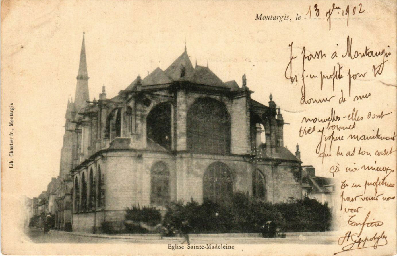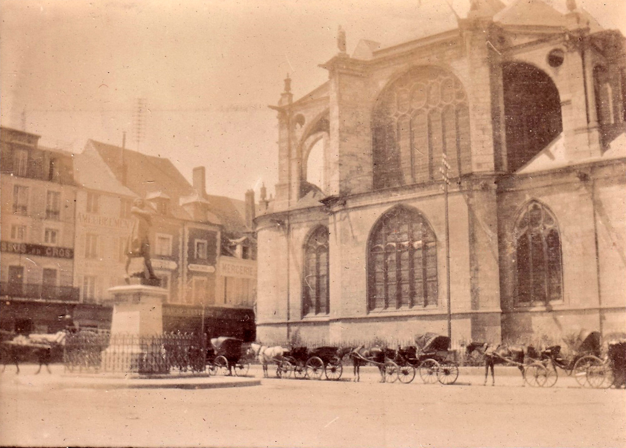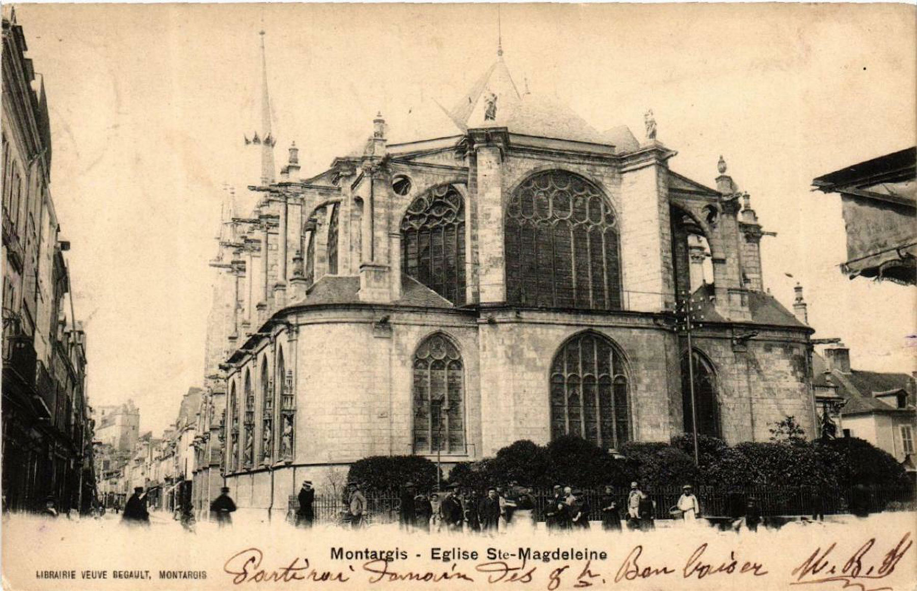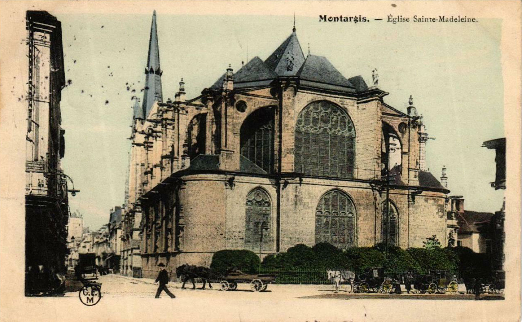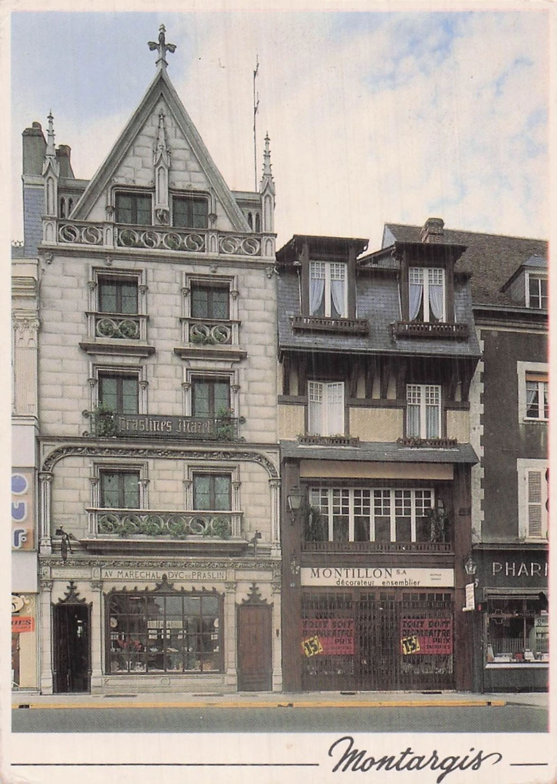 Auparavant, il y avait là un pâté de maisons assez basses, délimité par quatre rues : la première était notre rue de Loing, la deuxième devant le chevet de l’église, n’avait pas de nom officiel : on l’appelait « la ruelle du cloître » ou « la ruelle qui mène au cloître ». Il s’agissait des logements et du cloître des chanoines. Au rez-de-chaussée de ces bâtiments, il y avait des boutiques. La troisième, aujourd’hui rue Triqueti / rue du Grenier à Sel, était la rue des Pourceaux.