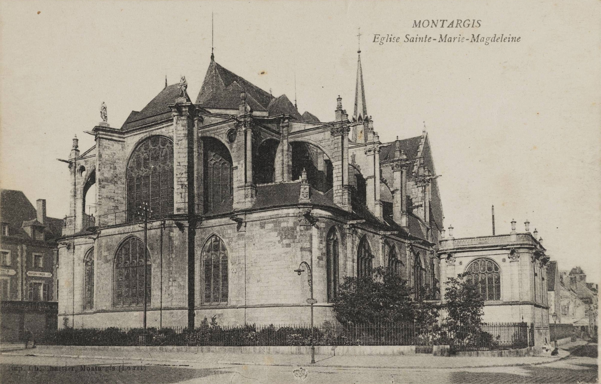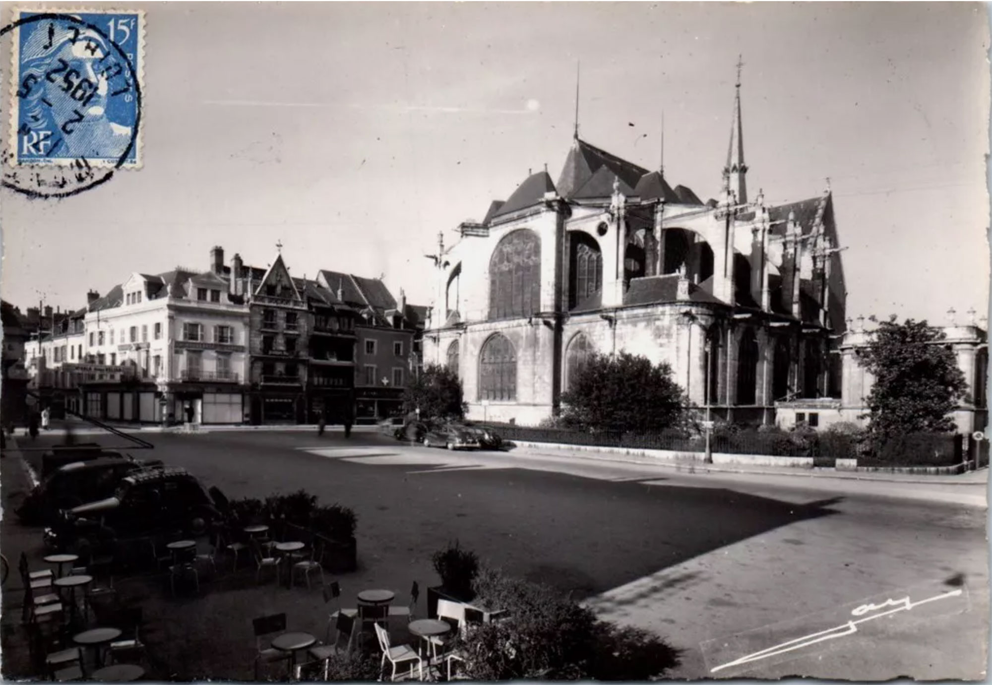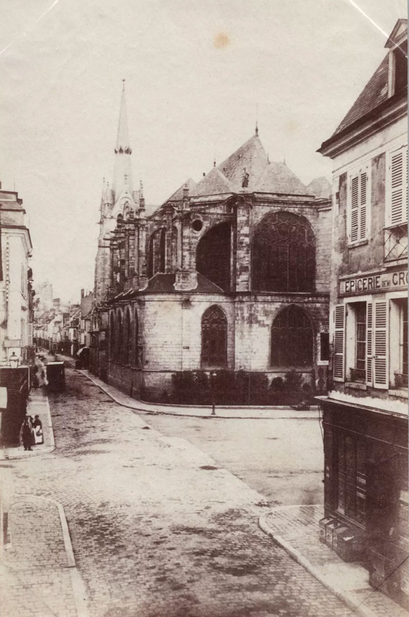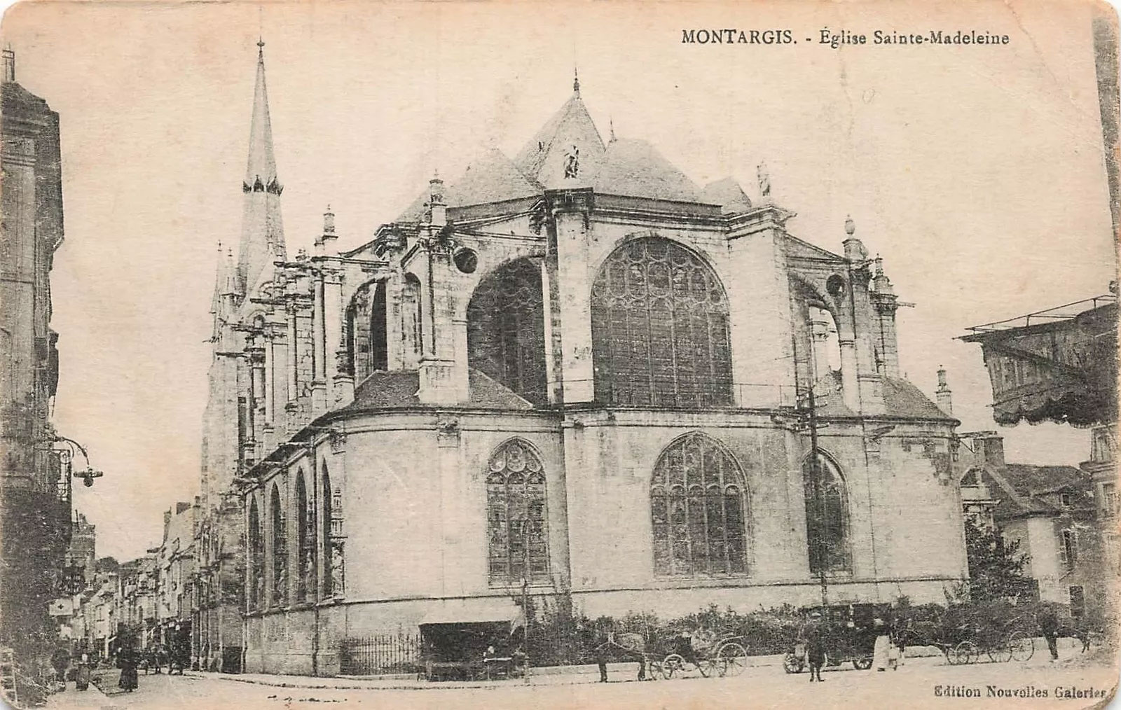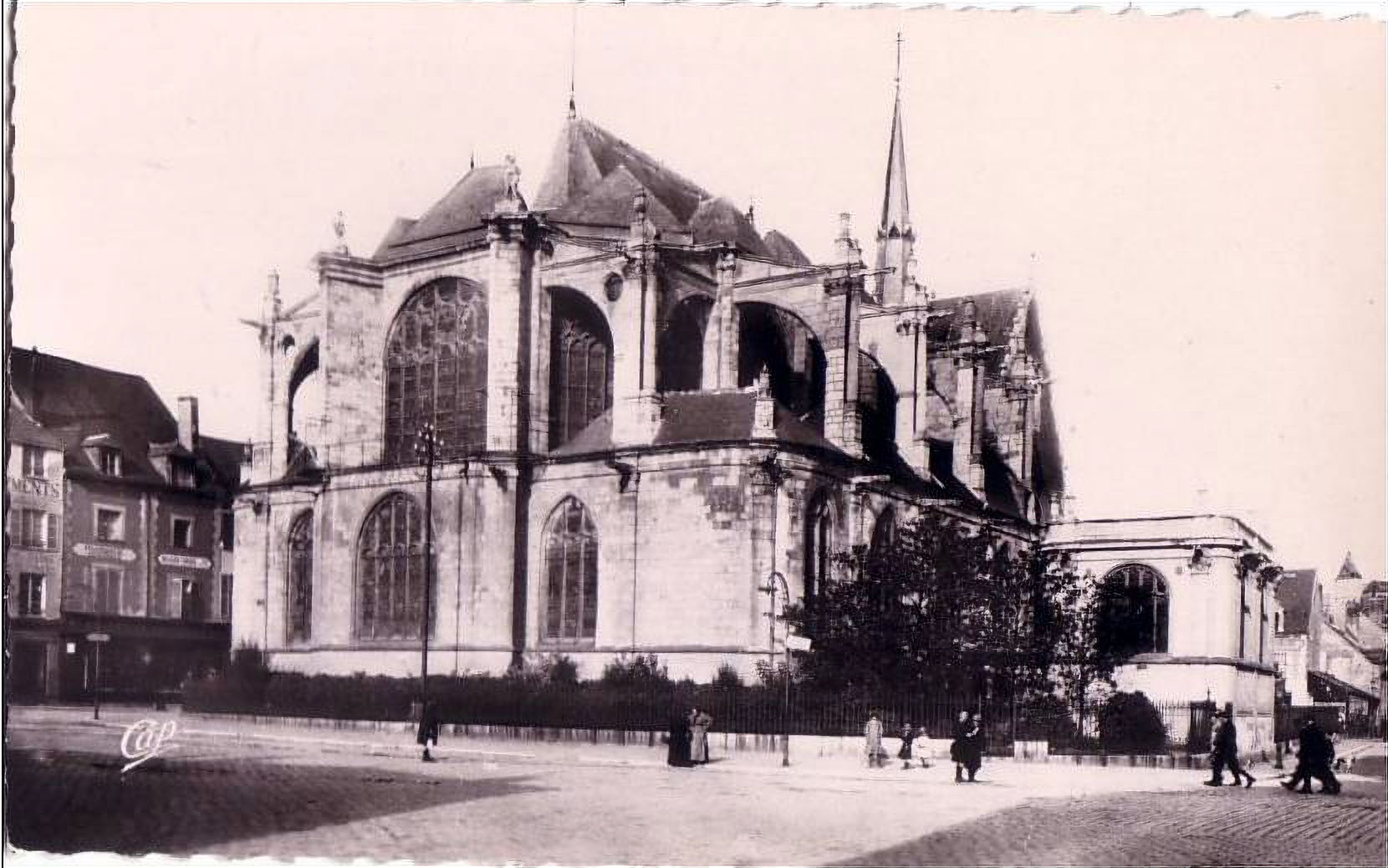 Auparavant, il y avait là un pâté de maisons assez basses, délimité par quatre rues : la première était notre rue de Loing, la deuxième devant le chevet de l’église, n’avait pas de nom officiel : on l’appelait « la ruelle du cloître » ou « la ruelle qui mène au cloître ». Il s’agissait des logements et du cloître des chanoines. Au rez-de-chaussée de ces bâtiments, il y avait des boutiques. La troisième, aujourd’hui rue Triqueti / rue du Grenier à Sel, était la rue des Pourceaux.